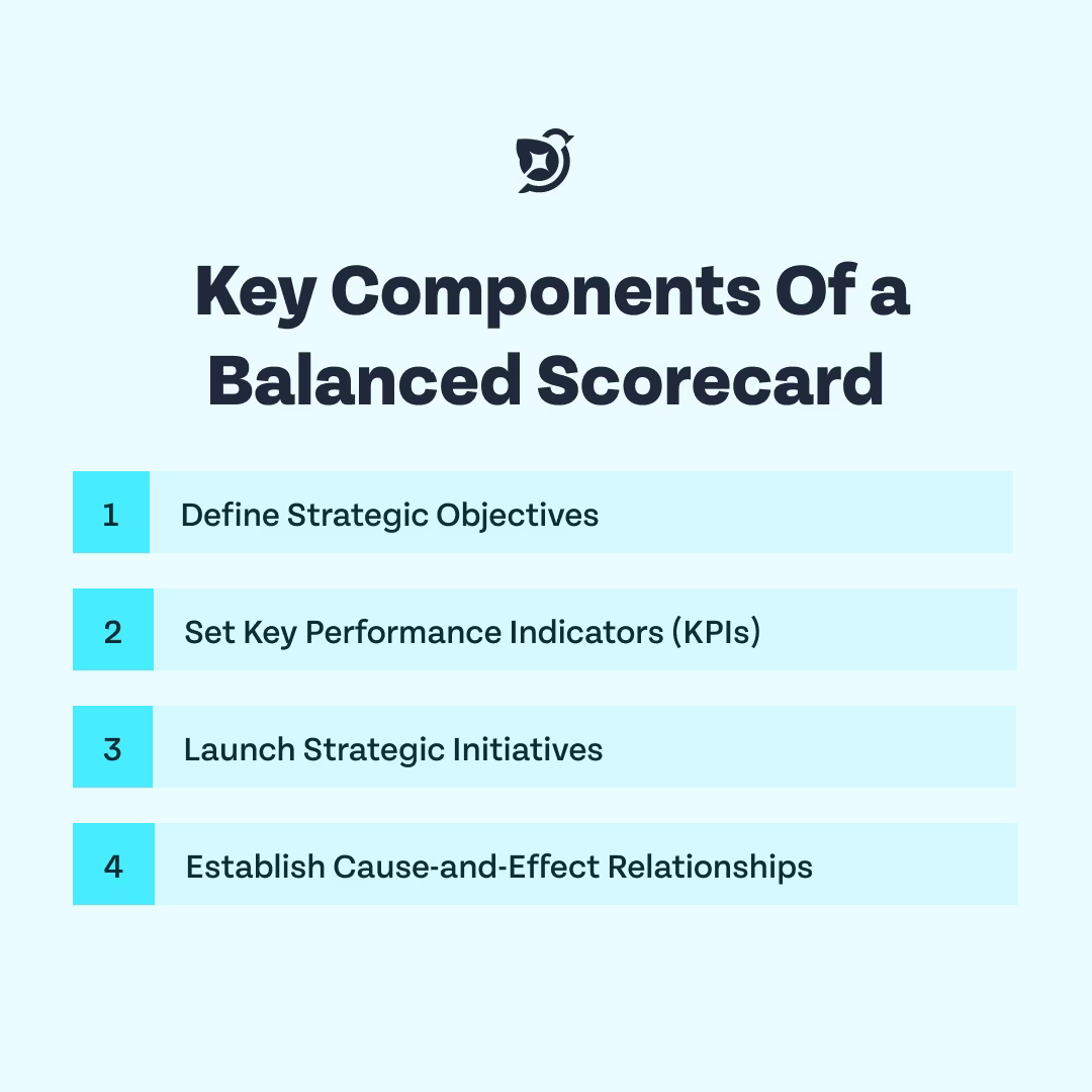 The Balanced Scorecard is more than a reporting framework — it’s a management system made up of interconnected components that turn strategy into action. At its heart, the BSC ensures that every initiative, every KPI, and every department contributes to the bigger picture. It does this by combining four building blocks: strategic objectives, key performance indicators (KPIs), strategic initiatives, and cause-and-effect relationships.