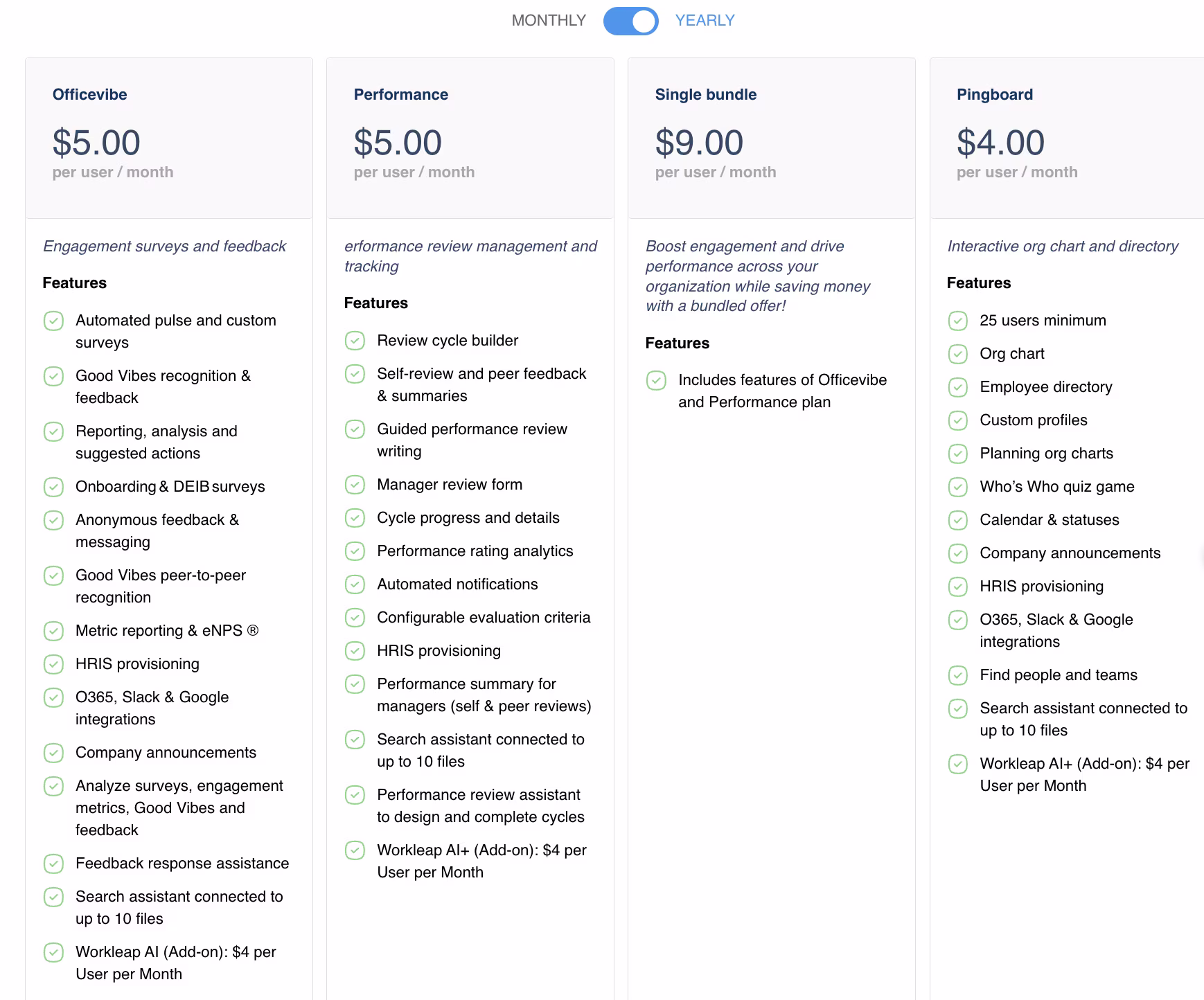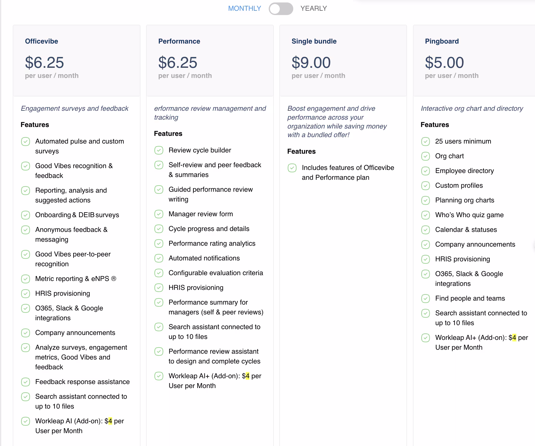 Looking at Workleap's current pricing structure, Officevibe costs $6.25 per user per month when you pay monthly, but here's where it gets interesting - if you commit to paying annually, you get it for just $5.00 per user per month. That's a pretty decent savings if you're planning to stick with it for the long haul.
