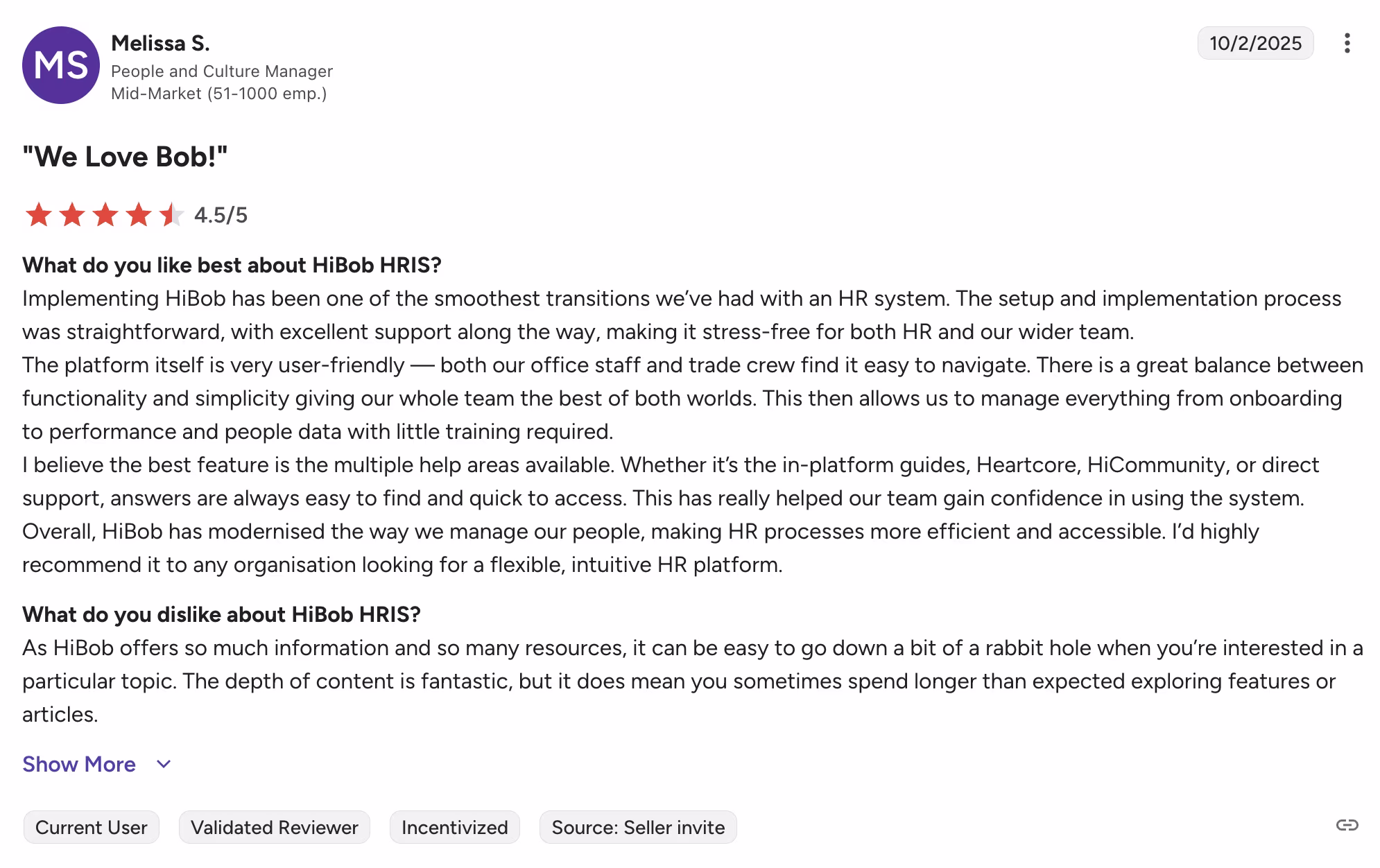 HiBob (Bob) is a modern HRIS platform built specifically for growing, people-centric companies. Instead of trying to be everything to everyone, it focuses on user experience, employee engagement, and streamlined workflows that make HR feel less like bureaucracy and more like community building.