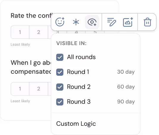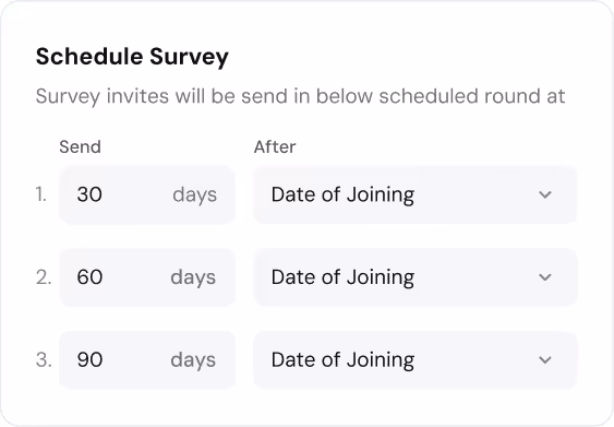 You can schedule 30/60/90-day check-ins post-joining or trigger exit surveys a few days before the last working day. Each survey adapts to the employee’s timeline.