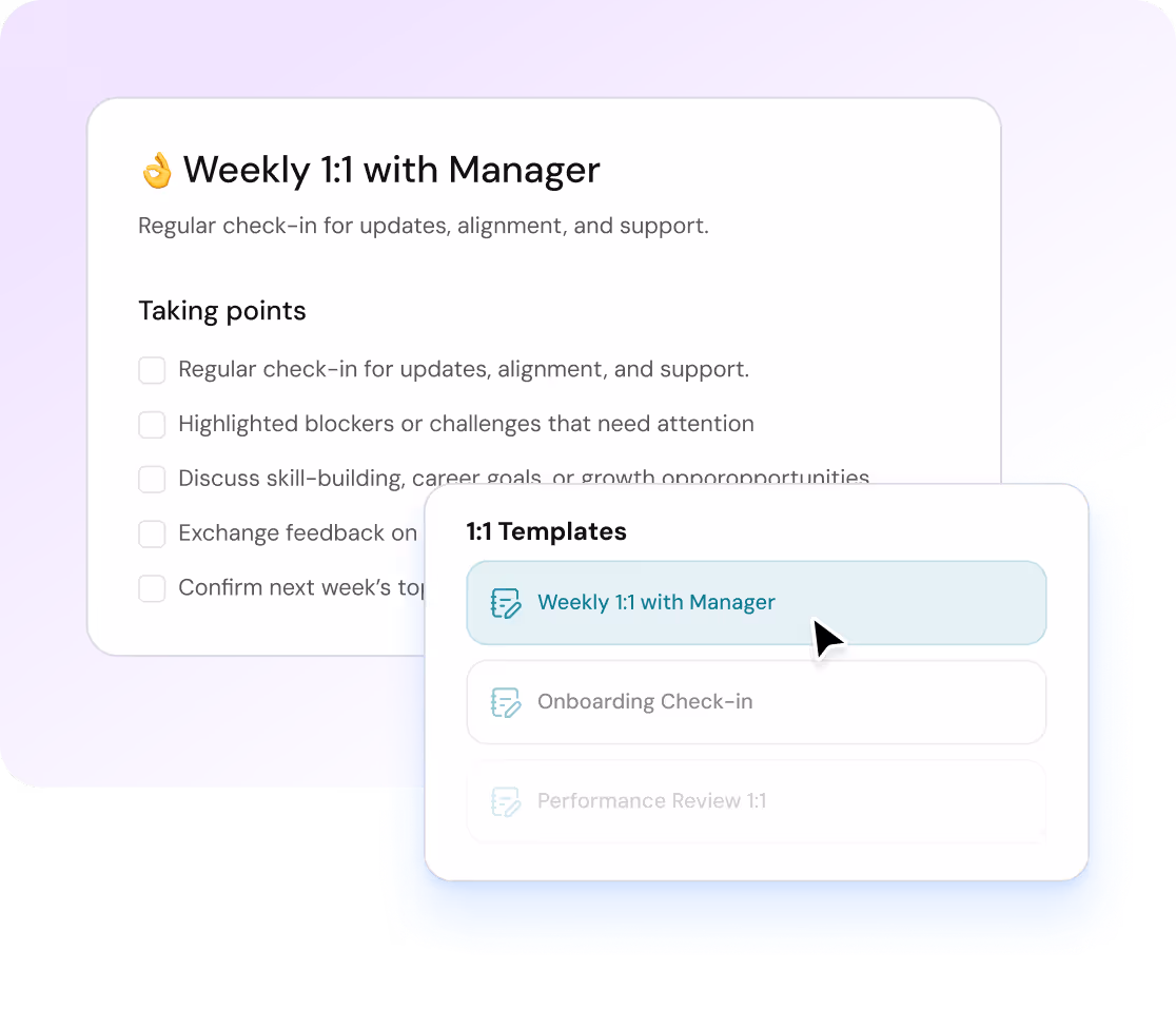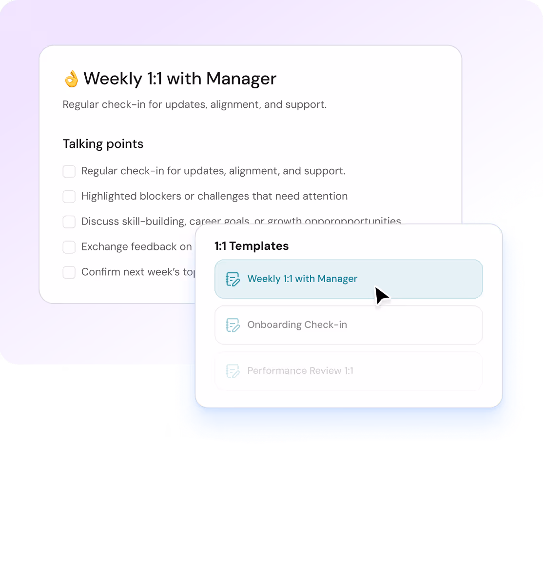 Use pre-built templates or create your own for growth talks, check-ins, or exit interviews. Carry forward unfinished topics automatically to keep progress continuous.
