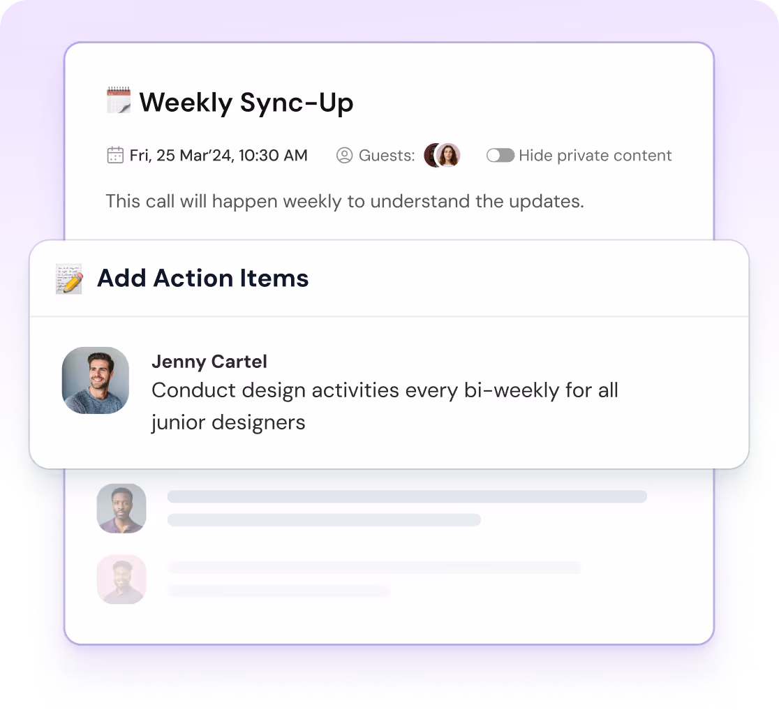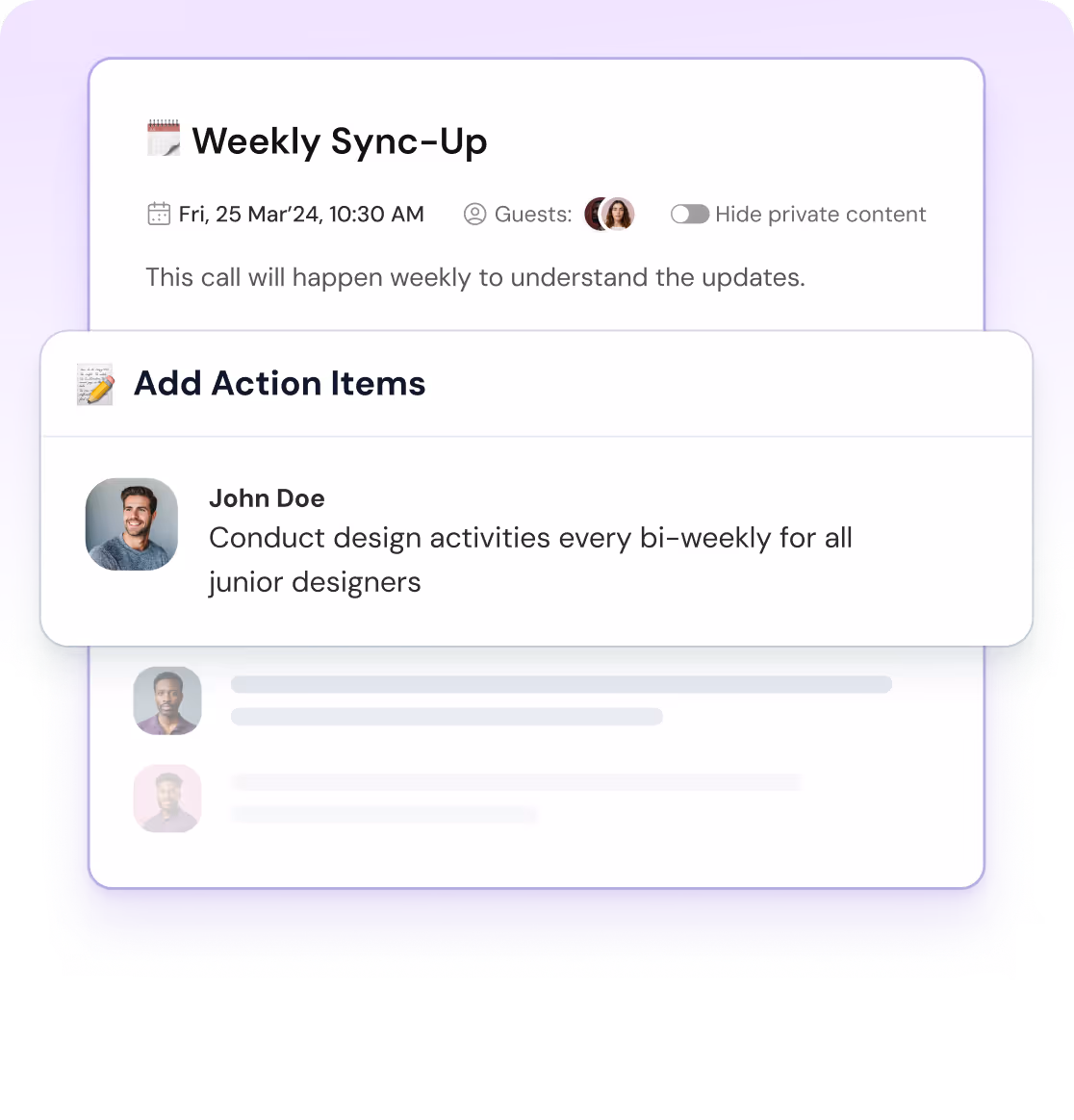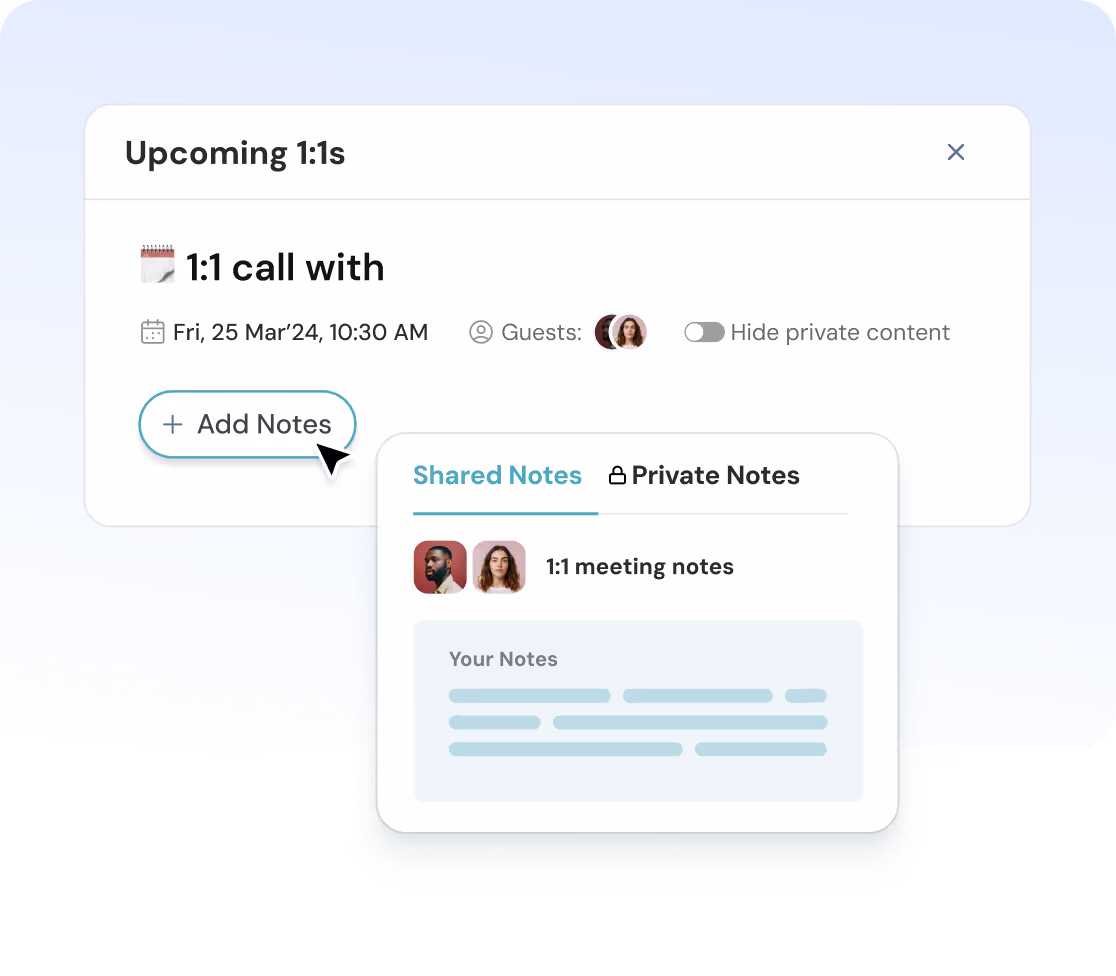 Take shared notes for alignment or private ones for reflection — all in one place. Capture ideas, decisions, and follow-ups right where the conversation happens.