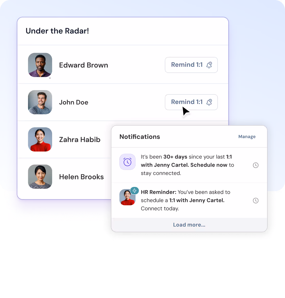 Get instant visibility into who’s missing regular one-on-ones and send reminders in a click. Keep your feedback loops active and ensure no employee slips through the cracks.