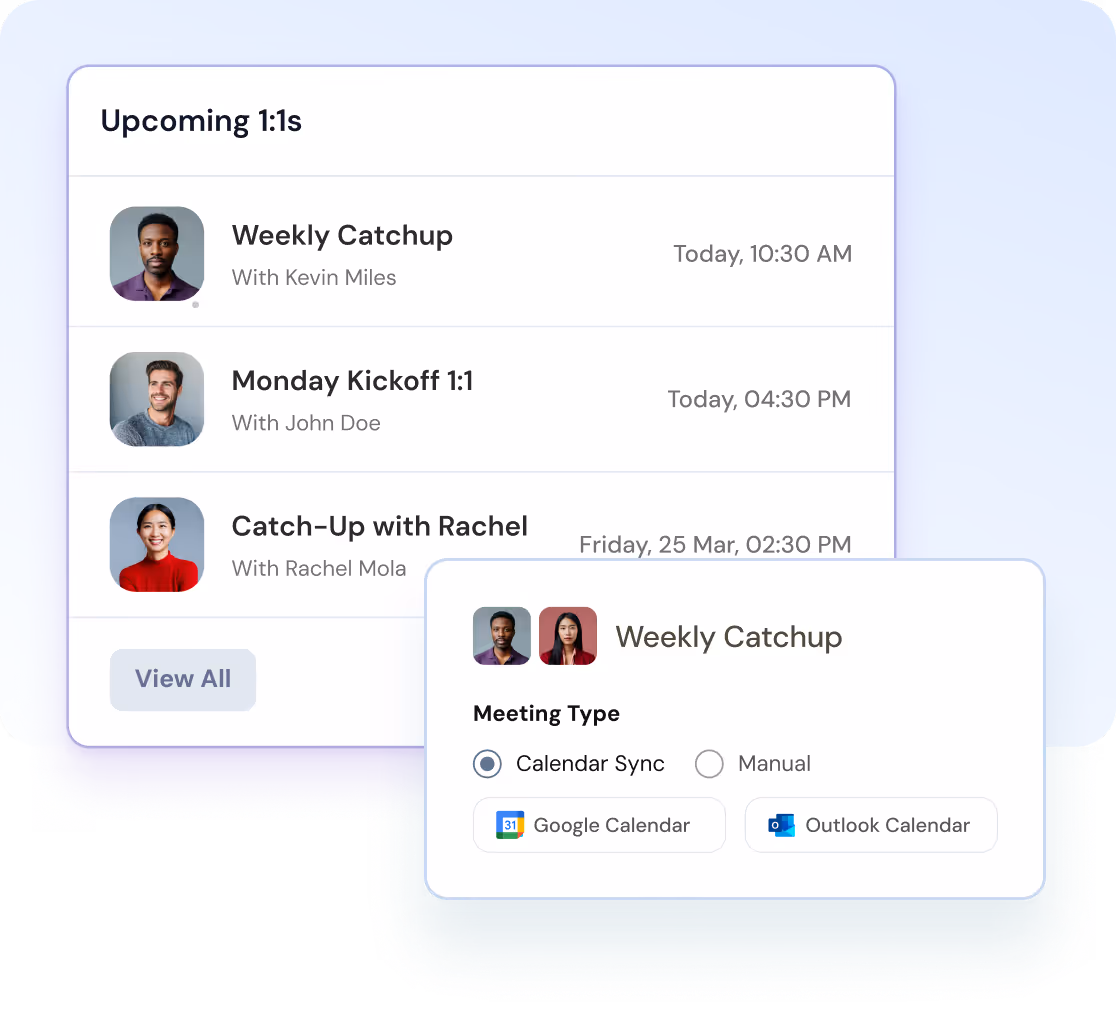 Connect Outlook or Google Calendar and your one-on-ones schedule themselves. Import existing meetings or create new ones, everything stays perfectly aligned.